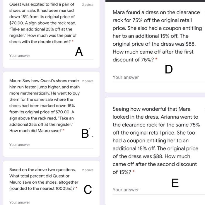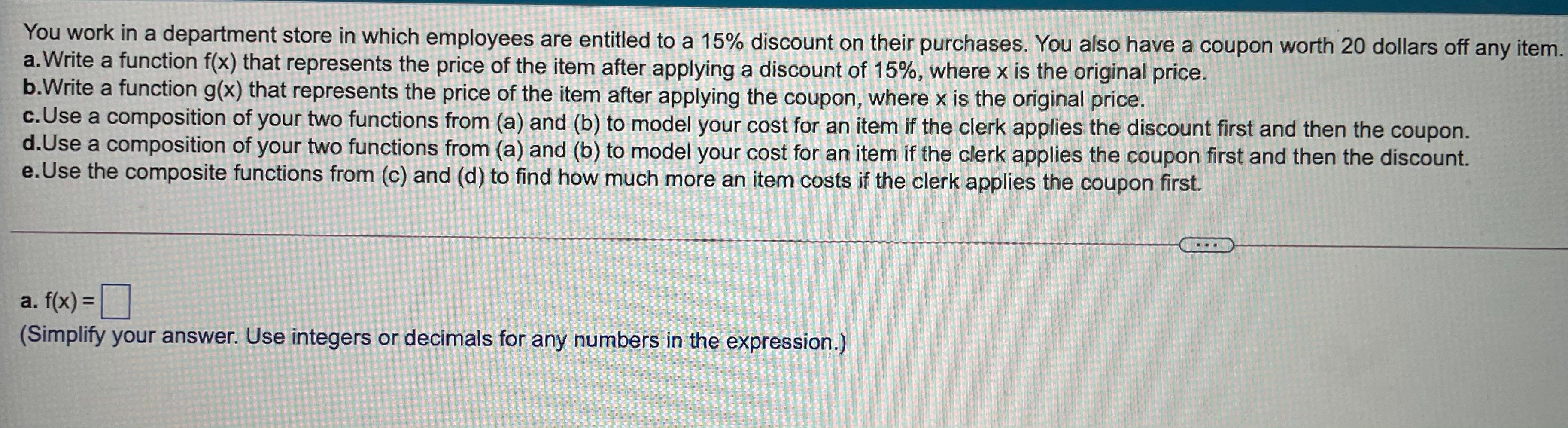 Solved If you are calculating a 15% off discount, you need - Chegg If you are calculating a 15% off discount, you need to to know the sale price. (1 add 15% to the original price O multiply the original price by 15% multiply the original price by 85% subtract 85% from the original price . You are purchasing 2 shirts at $15.00 (each) and 1 pair of jeans at $30.00 (eachl. You have a coupon for poin 10% off. 70% Off Go Edu Chegg Black Friday Savings, Coupons ... - Couponannie 15 % OFF Grab Additional 15% Off on Regular-Priced Items with Discount Code Used 4 Times Get Code See Details 5 % OFF Receive 5% Off on Your Go Edu Chegg First Purchase Used 3 Times Get Code See Details 35 % OFF Enjoy 35% Off Sitewide Used 6 Times Get Code See Details 40 % OFF Go Edu Chegg Flash Sale Coupon Codes: 40% Off Used 3 Times Get Code 15% off Dreo Coupons & Promo Codes + Free Shipping 2022 Popular Dreo Coupons. Discount. Description. Expires. 15% Off. 15% off any order. 11/23/2022. Sale. 30-Day Return Policy. Home Depot Coupon 15% Off : r/BlazeOffers - reddit.com Click for Home Depot Coupon 15% Off. Simply visit the website and pick the best coupon, promo code or discount deals giving best offer for your shopping cart. comments sorted by Best Top New Controversial Q&A Add a Comment . More posts you may like.
