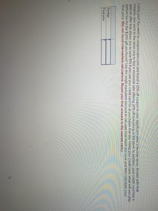 Chegg 15% off coupon. Home Depot 15% Off Coupon Online : r/BlazeOffers Here is the Home Depot 15% Off Coupon Online. You can save good amount of money on your Home Depot purchase by using the promo, coupon codes or discount deals from this website. 25% Off chegg.com Coupons & Promo Codes, October 2022 Save with Chegg 5 Off Coupon & Promo codes coupons and promo codes for October, 2022. Today's top Chegg 5 Off Coupon & Promo codes discount: 25% Off Your First Month Subscription With This Chegg Promo Code ... Don't miss your discount! $15 OFF with Chegg discount. Grab your savings today at Chegg! Hot specials don't last forever. Get Code ... Solved Morgan's Department Store emailed out 15%-off coupons | Chegg.com Answers (work needs to be shown): a) $200.60 b) 32% Show transcribed image text Expert Answer 100% (2 ratings) a. Sale price = $295 Discount = 20$ Coupon discou … View the full answer Transcribed image text: Morgan's Department Store emailed out 15%-off coupons for its 20th Anniversary Sale. The coupons may be used for any products in the store. Up to 95% OFF | Chegg Coupon & Discounts - Nov. 2022 Coupon Verified. 48 People Used. Score Up To 90% Off Textbooks + Free Delivery On Orders Over $35 Using This Chegg Coupon. Get huge dicounts for you with our chegg coupon. Prices may vary daily. Take action now, these prices are as good as they get! Expires 11/17/2022. KMS0STC9. Show Code.